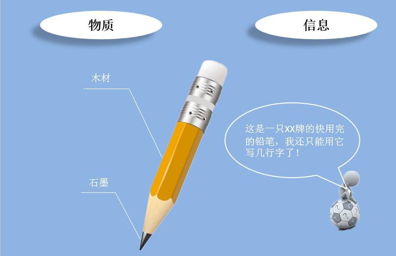 以一支铅笔为例,铅笔是由木材,石墨,油漆等构成的,它们都是真实存在的“物质”;而铅笔上的商标图案,铅笔的用途等就是我们对基本信息处理之后,再加上我们自身拥有的知识而形成的新的较为复杂的信息。