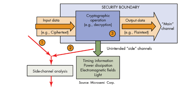 侧信道分析(例如差分电源分析 DPA 或者差分电磁分析 DEMA)用于从未经保护的处理器或者 FPGA 之中提取加密密钥。
